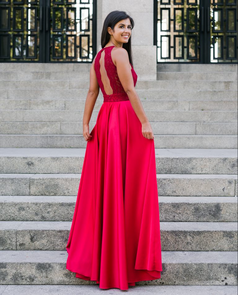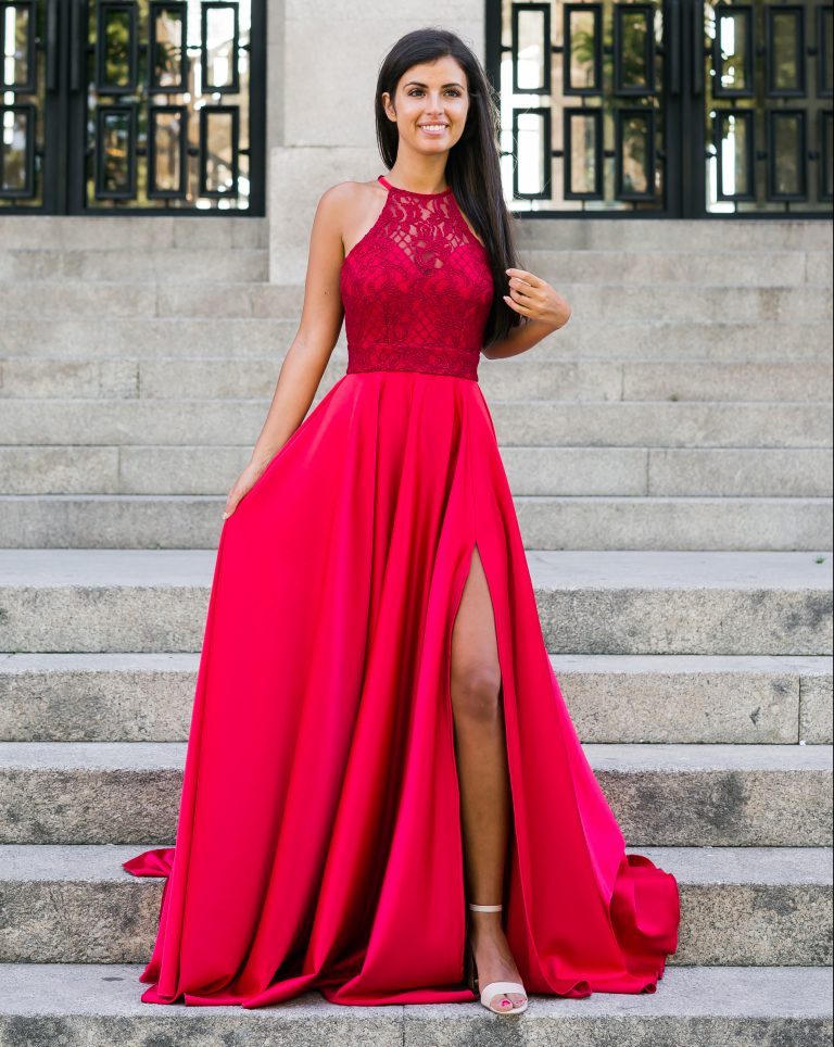 Maravilhoso vestido com corpete rendado com peito em corte coração e halter neck.