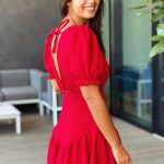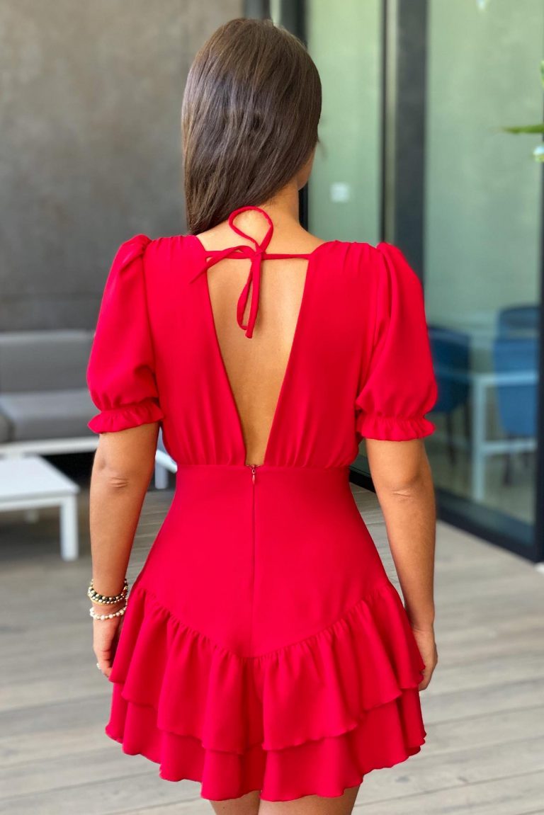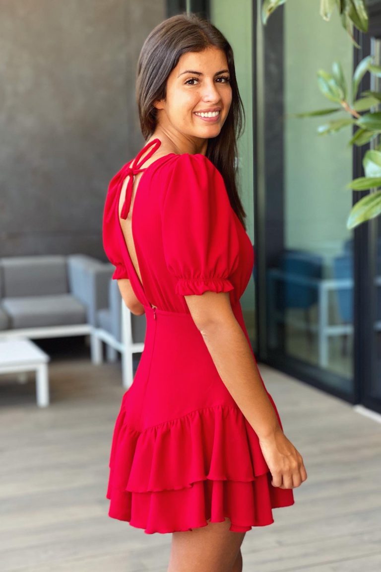 A modelo está a usar o tamanho S em vermelho.