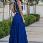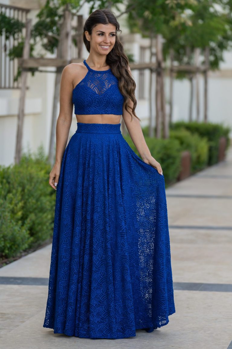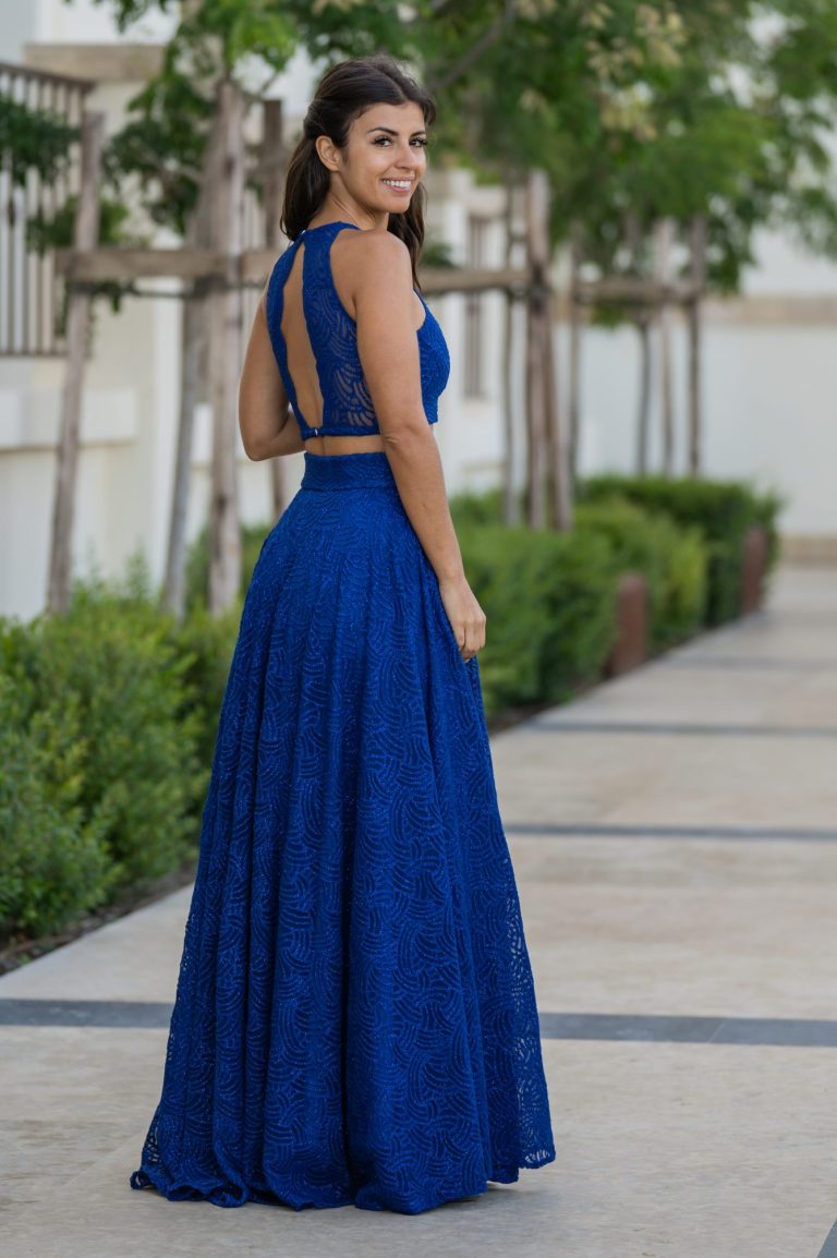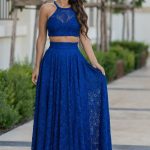 Maravilhoso conjunto de top e saia com top rendado com halter neck e costa aberta.