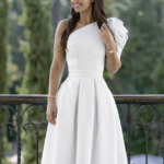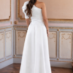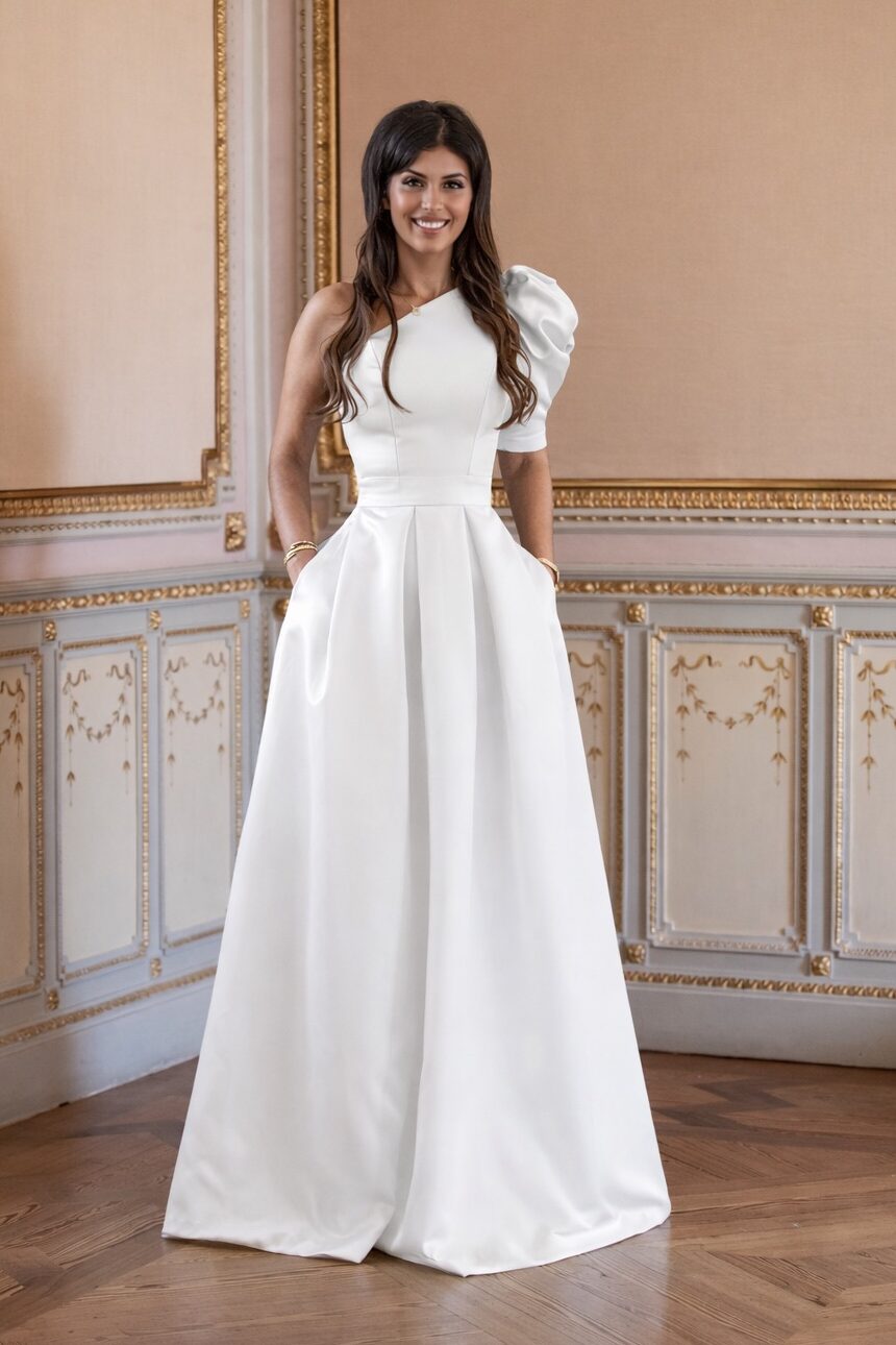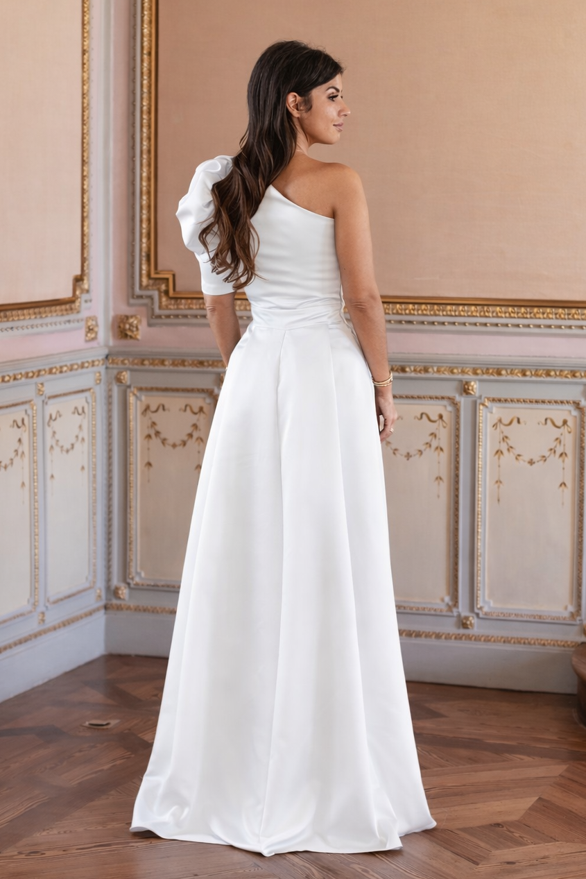 Confeccionado em mikado liso e estruturado em tom verde-turquesa, este vestido distingue-se pela sua manga volumosa, que confere um toque romântico e contemporâneo. A cintura marcada realça a silhueta, enquanto a saia ampla com pregas subtis cria um movimento leve e harmonioso.