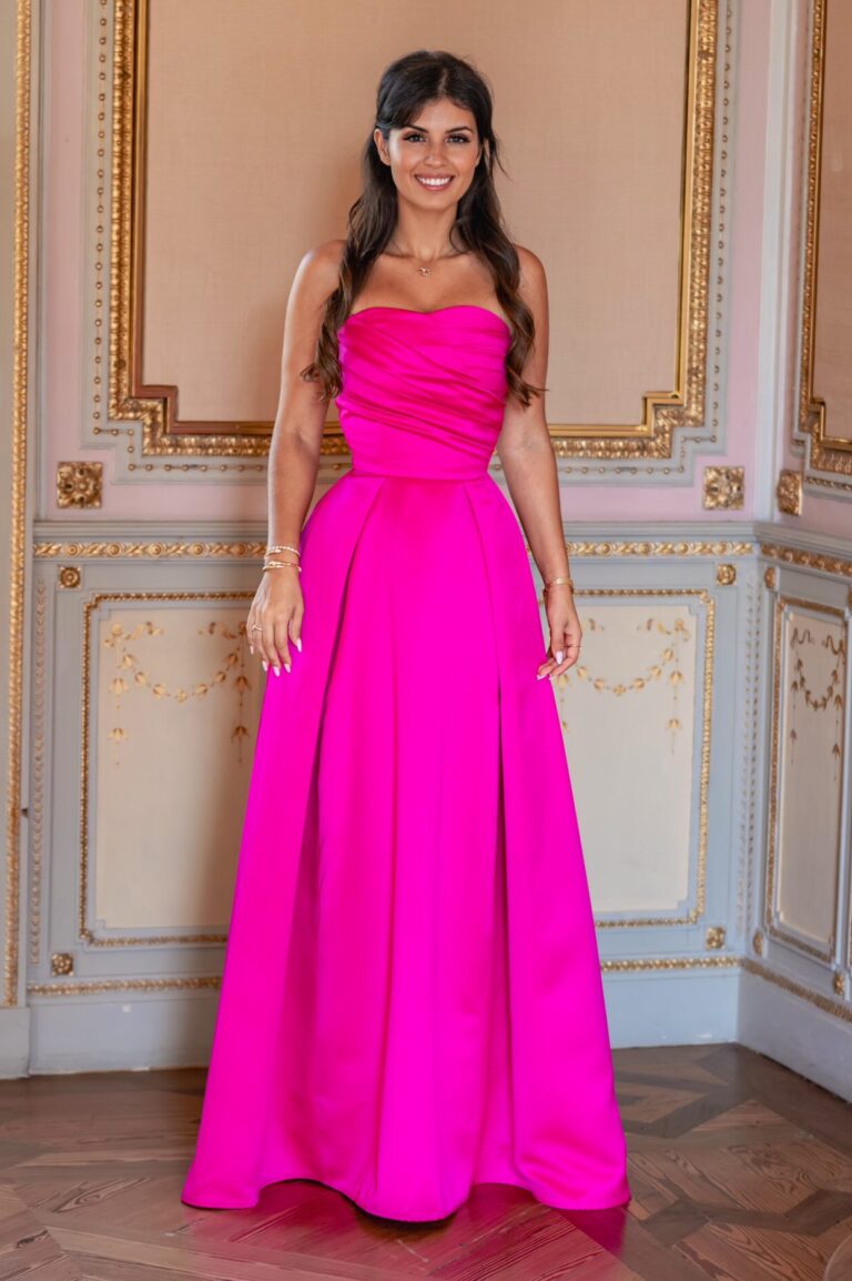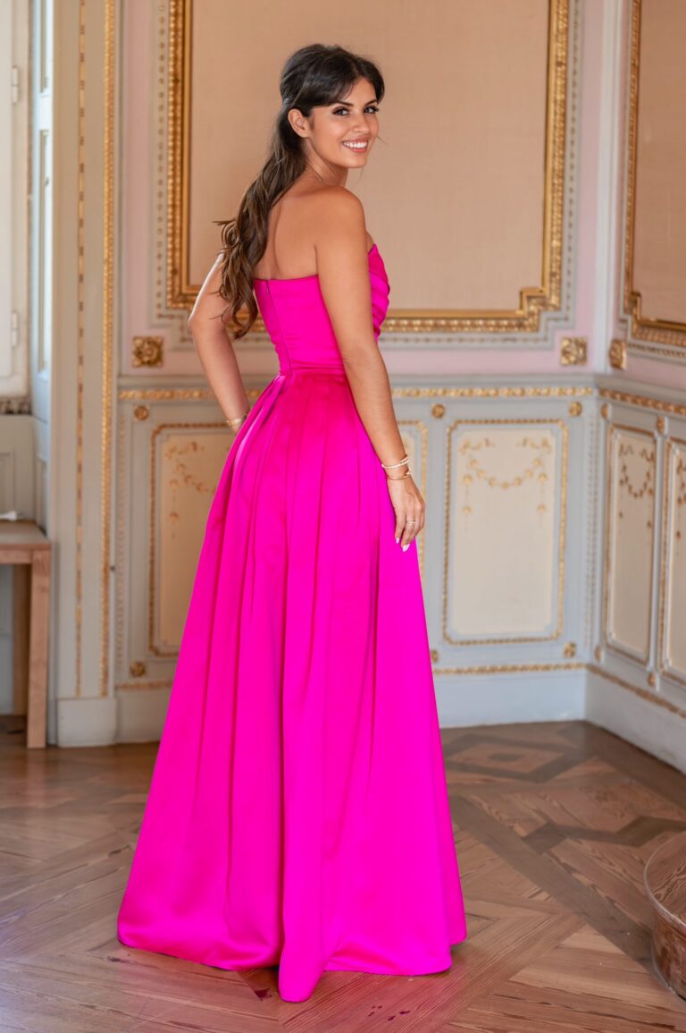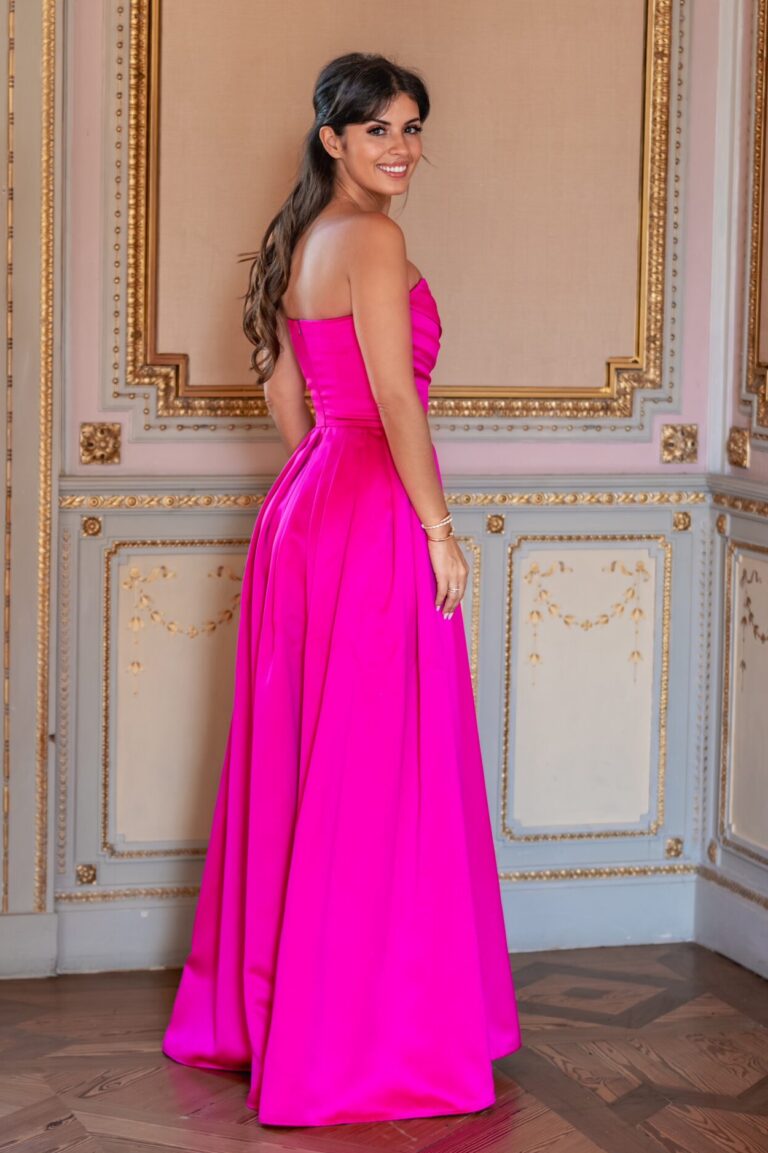 👗 Versão Longa Clássica – Ideal para cerimónias formais, este modelo apresenta uma silhueta fluida e intemporal, com corte cintado e saia ampla, perfeita para criar um visual requintado e majestoso.