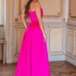 O tecido em cetim de tom azul petróleo confere um brilho elegante e luxuoso, enquanto o corpete drapeado com decote em coração favorece o colo e a silhueta. Fecha com fecho invisível nas costas para um ajuste perfeito.