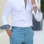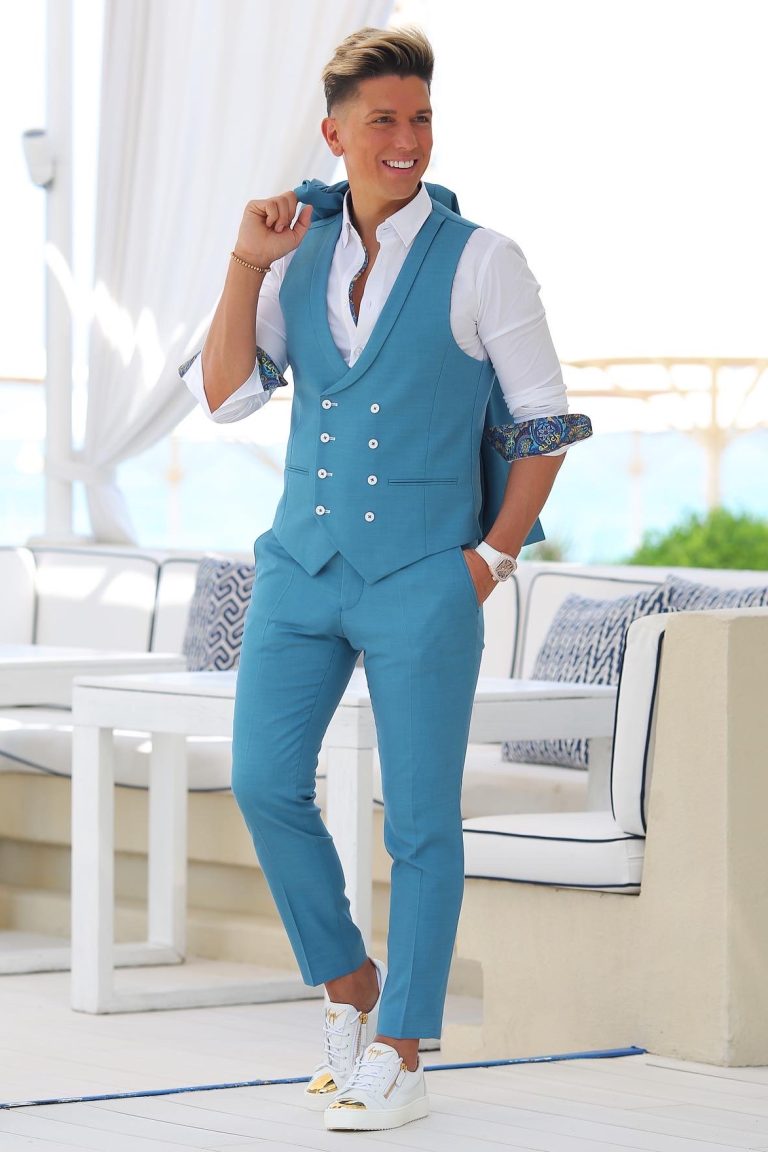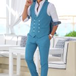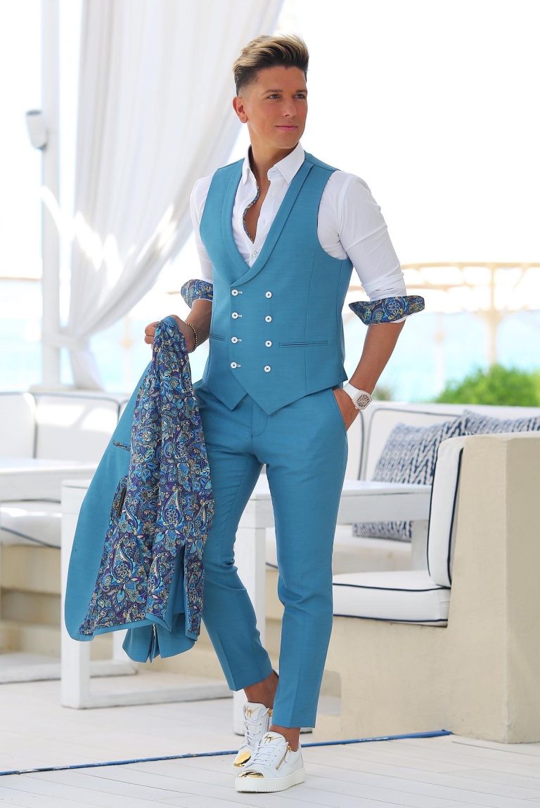 Fato de homem slim fit com elastano. Blazer de 2 botões, com lapela de 11 cm em bico com pic exterior de 5mm e forrada a feltro na parte junto ao pescoço. Forro completo acetinado, para maior conforto.Duas Aberturas traseiras. Calças com cós reforçado e presilhas. Com fecho-éclair, botões e colchete ocultos. Bolsos laterais. Calças com forro até ao joelho, para maior conforto.
