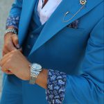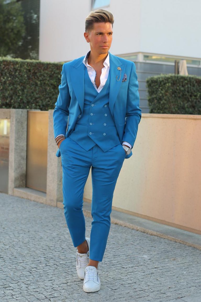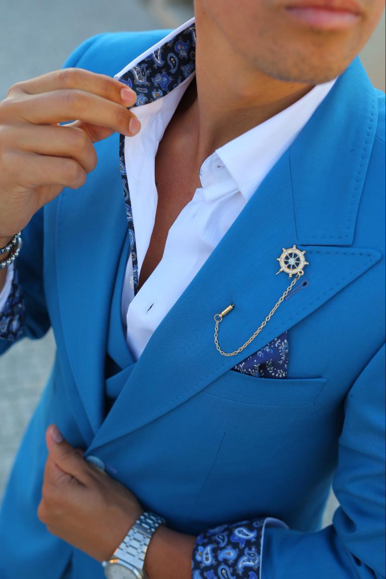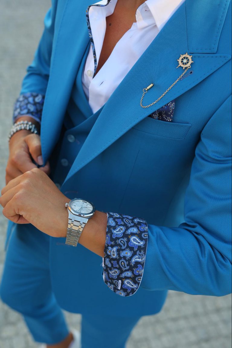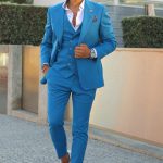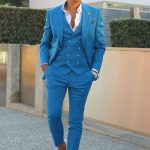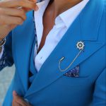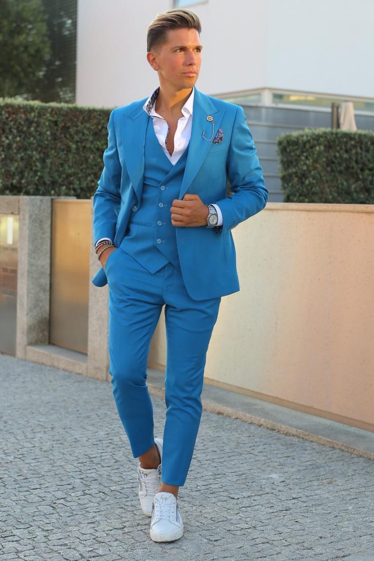 Fato de homem slim fit com elastano. Blazer de 2 botões, com lapela de 11 cm em bico com pic exterior de 5mm e forrada a feltro na parte junto ao pescoço. Forro completo acetinado, para maior conforto. Com 4 bolsos exteriores, 2 de um lado e 1 do outro inclinados, 1 de peito, 3 interiores e apoio para caneta. Uma Abertura traseira. Calças com cós reforçado e presilhas. Com fecho-éclair, botões e colchete ocultos. Bolsos laterais. Calças com forro até ao joelho, para maior conforto. Confecionado em Portugal pela GLÜCK LBN.