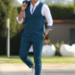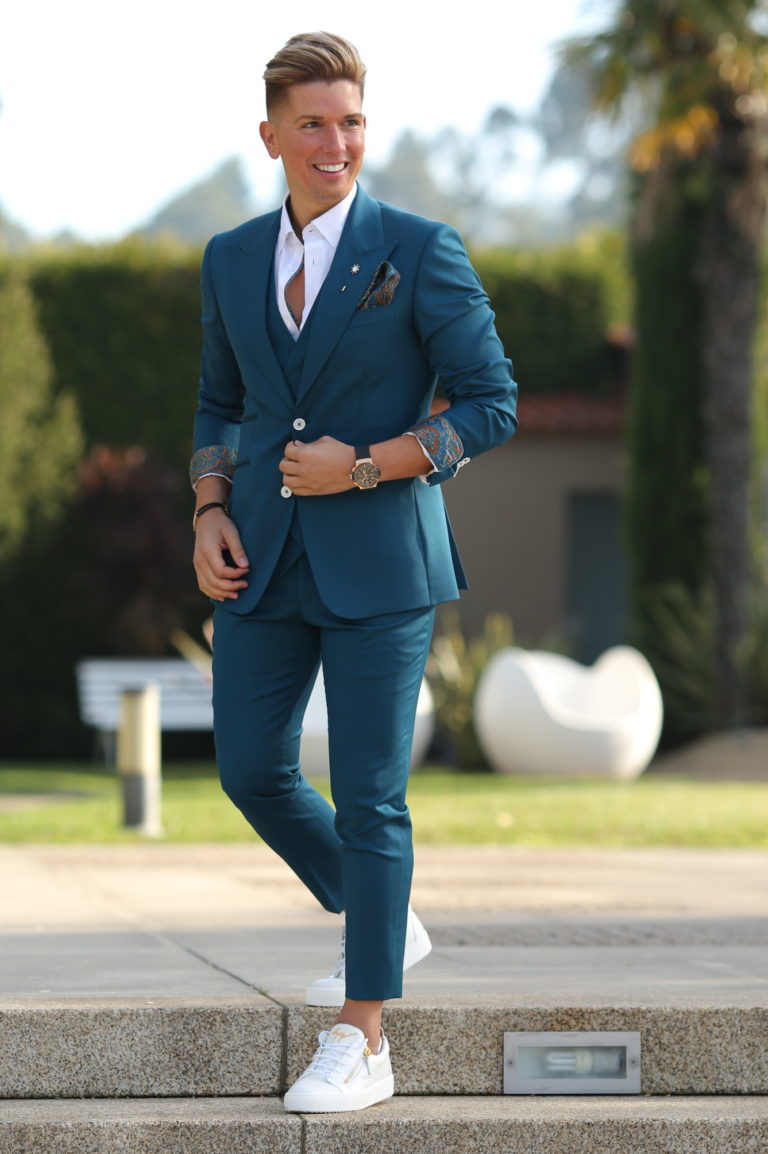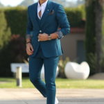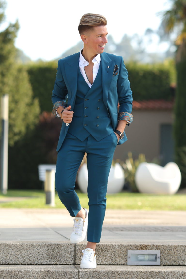 Fato de homem slim fit com elastano. Blazer de 2 botões, com lapela de 11 cm em bico com pic exterior de 5mm e forrada a feltro na parte junto ao pescoço. Forro completo acetinado, para maior conforto. Com 4 bolsos exteriores, 2 de um lado e 1 do outro inclinados, 1 de peito, 3 interiores e apoio para caneta. Uma Abertura traseira. Calças com cós reforçado e presilhas. Com fecho-éclair, botões e colchete ocultos. Bolsos laterais. Calças com forro até ao joelho, para maior conforto. Confecionado em Portugal pela GLÜCK LBN.