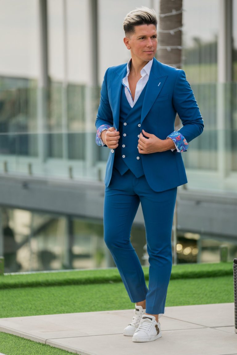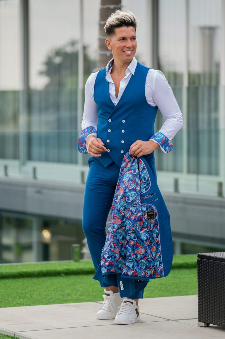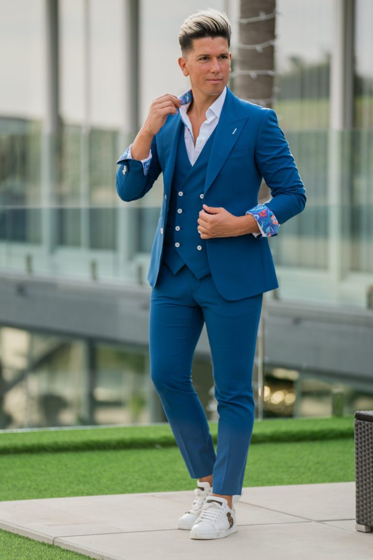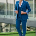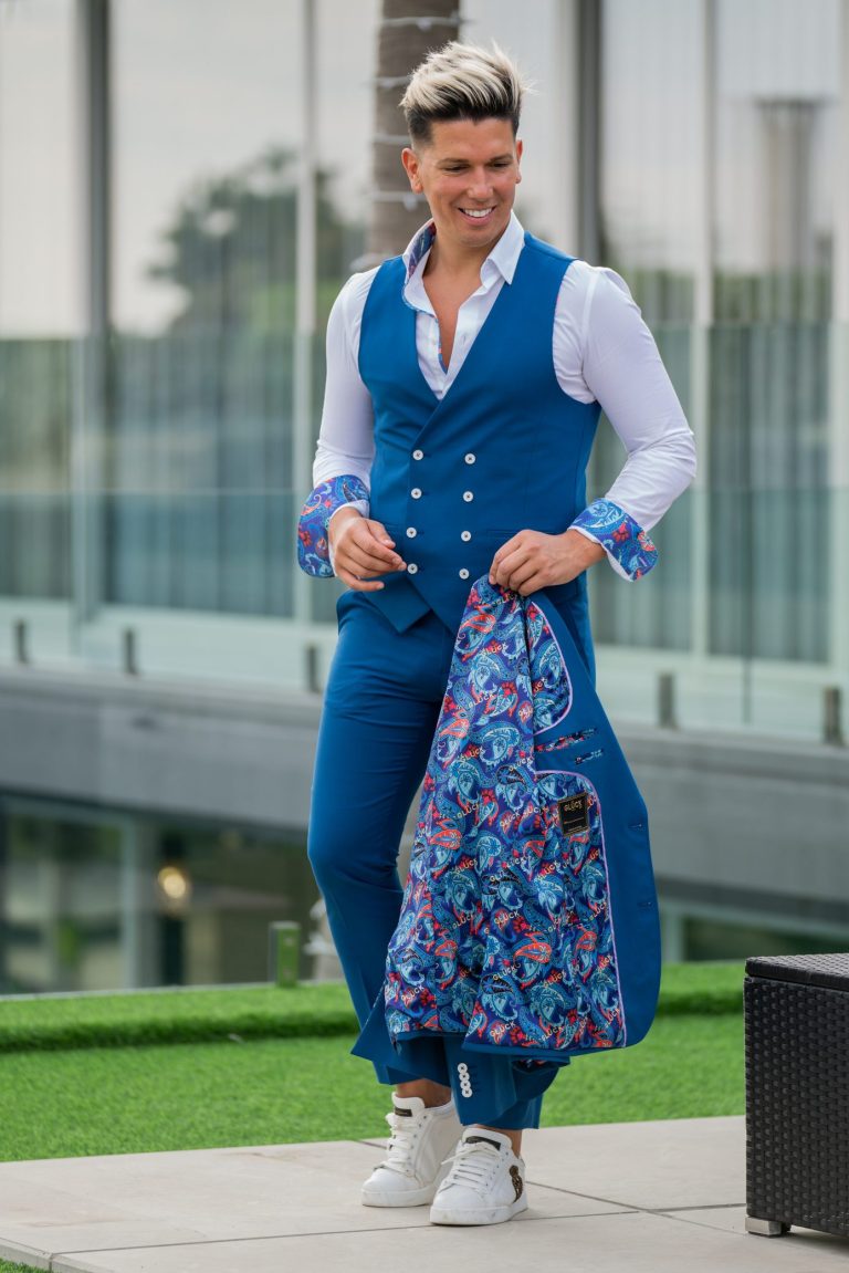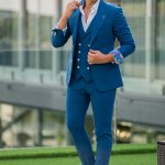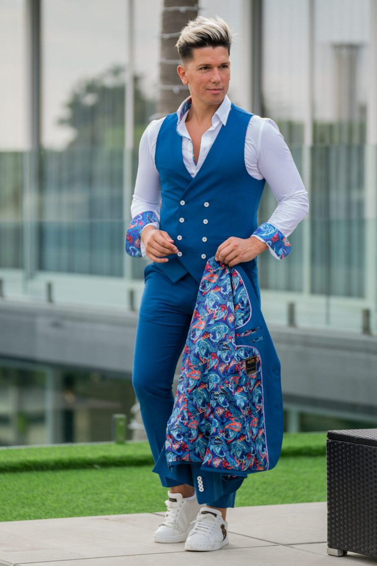 Fato de homem slim fit com elastano. Blazer de 2 botões, com lapela de 11 cm em bico com pic exterior de 5mm e forrada a feltro na parte junto ao pescoço. Forro completo acetinado, para maior conforto.Duas Aberturas traseiras. Calças com cós reforçado e presilhas. Com fecho-éclair, botões e colchete ocultos. Bolsos laterais. Calças com forro até ao joelho, para maior conforto.