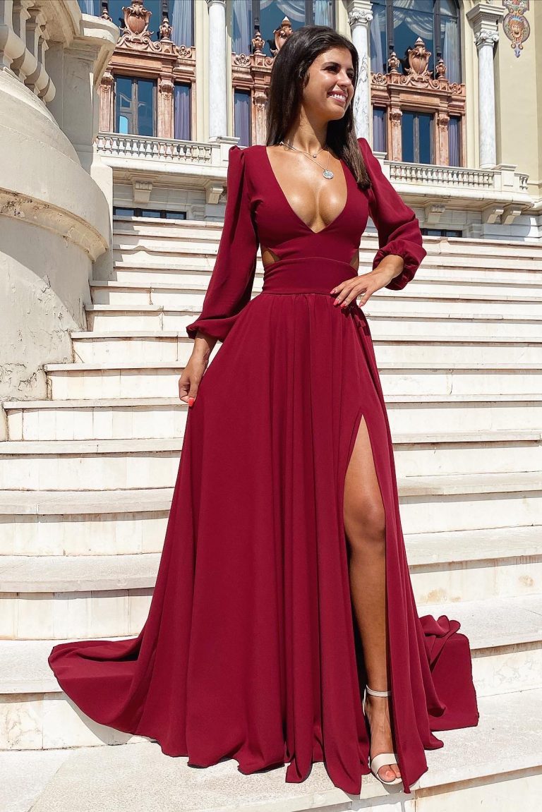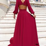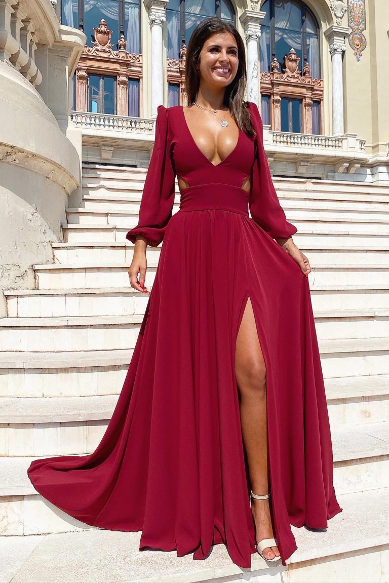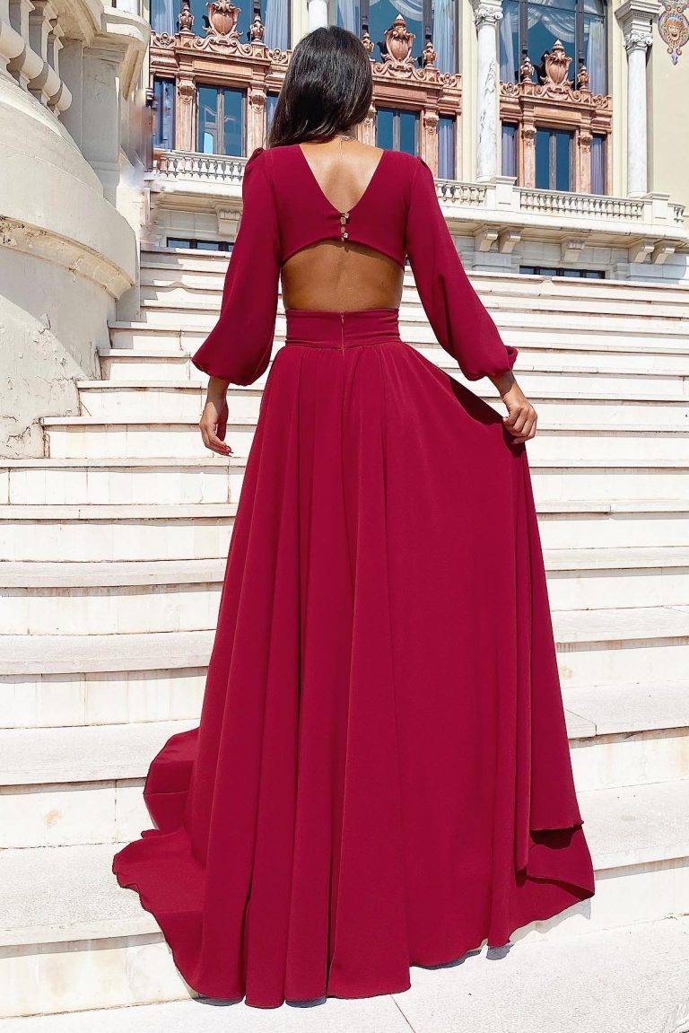 Maravilhoso vestido comprido fluído com decote na frente e na costa. Manga magnífica. Costa a fechar com dois botões centrais com brilhante.