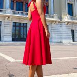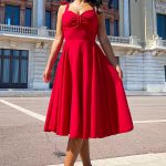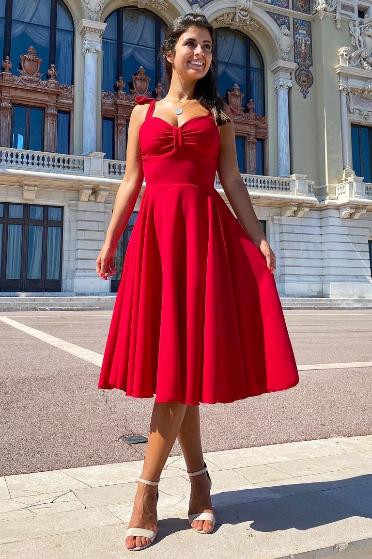 A modelo está a usar o tamanho S em vermelho.