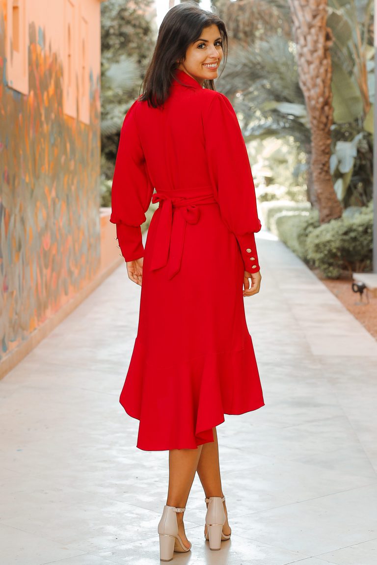 Este vestido MIDI tem uma silhueta dianteira Wrap e saia assimétrica fluida.